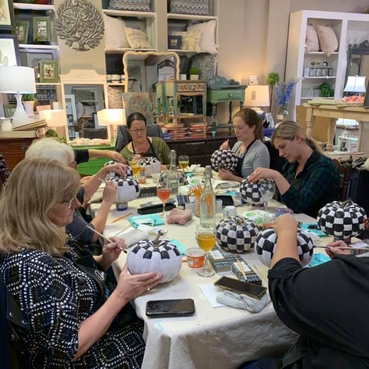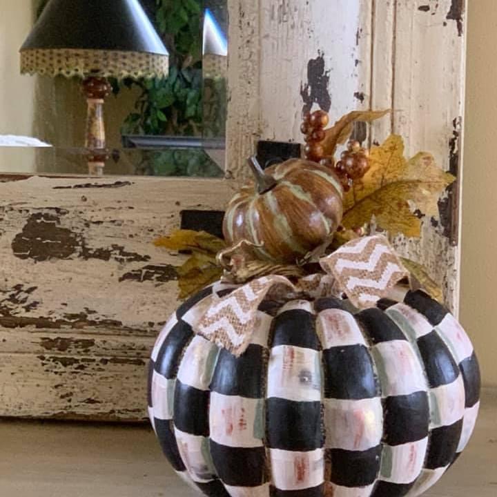 Back by popular demand!! A hand painted pumpkin inspired by the Black White Courtly Check pattern. A whimsical centerpiece for your Fall Decor. All supplies, snacks & drinks included.This is a popular class and fills up fast so please call and register.