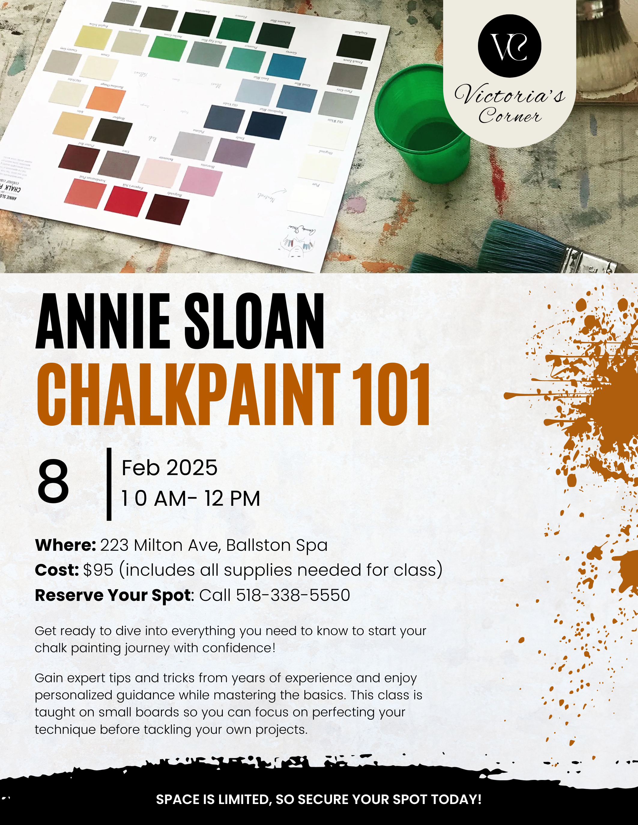 Learn the basics of Chalk Paint® by Annie Sloan. In this class you’ll learn three distinct finishes (smooth modern finish, layered distressed, & rustic), proper application of clear and dark waxes, brush-stroke techniques, wet sanding, distressing, gilding wax, custom color mixing and proper furniture prep for your in-home projects! Class fee is $95. RESERVATIONS REQUIRED